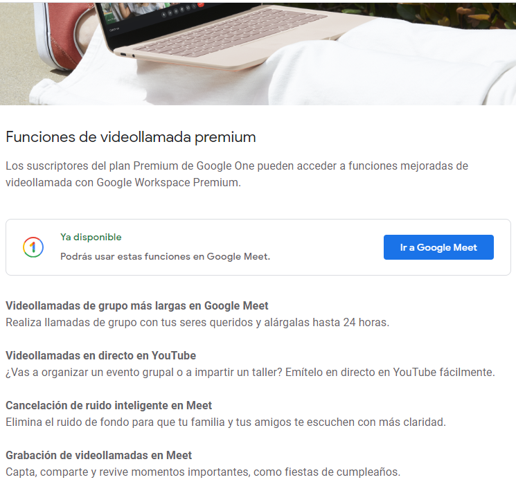 - Funciones de videollamada premium (Google Meet). Realiza llamadas de grupo con tus seres queridos y alárgalas hasta 24 horas.